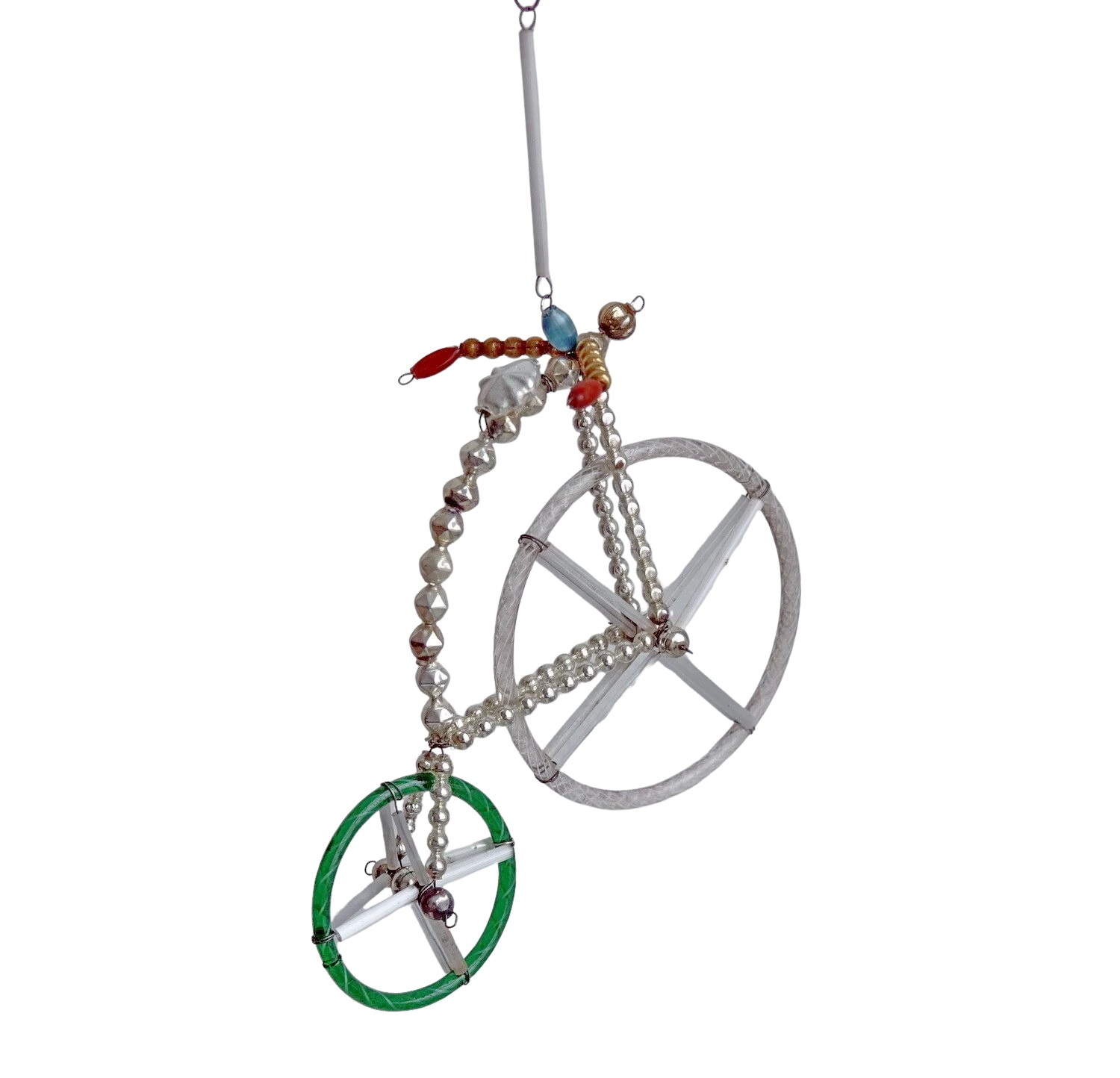 Dieser außergewöhnliche, sehr seltene Christbaumschmuck aus Gablonz zeigt ein Fahrrad. Das kunstvolle Handwerk und die authentische Gestaltung machen es zu einem einzigartigen Sammlerstück. Garantiert alt, keine Reproduktion – ein echtes Unikat aus der Zeit um 1930. Perfekt für eine hochwertige Sammlung oder als besonderes Dekorationsstück.