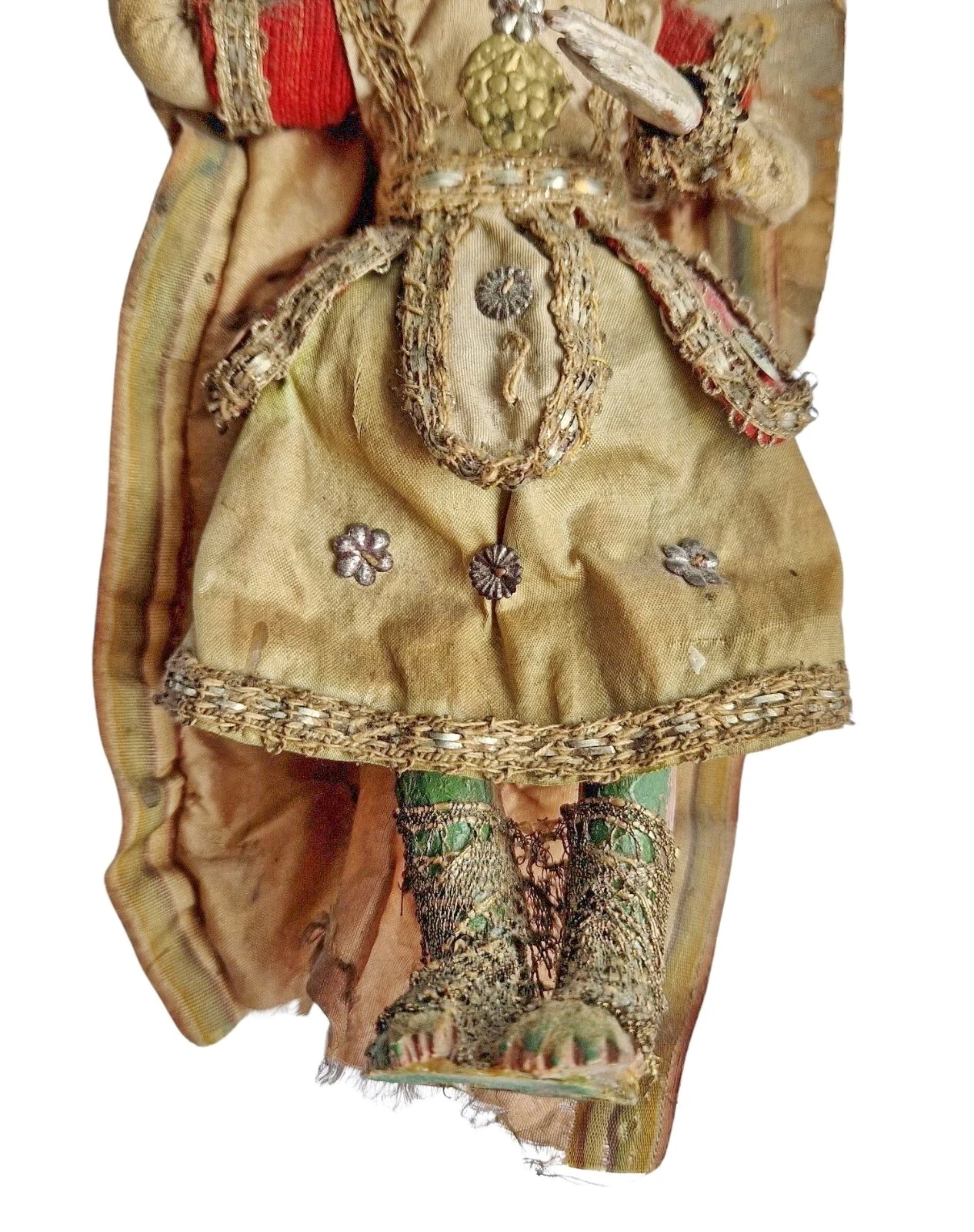 Material: Kopf aus Wachs, Körper innen aus Holz, Hände und Unterschenkel aus Holz geschnitzt und gefaßt. Kleidung aus Stoff mit Goldborte, Flügel aus mit Goldfolie beschichtetem Karton, Draht.