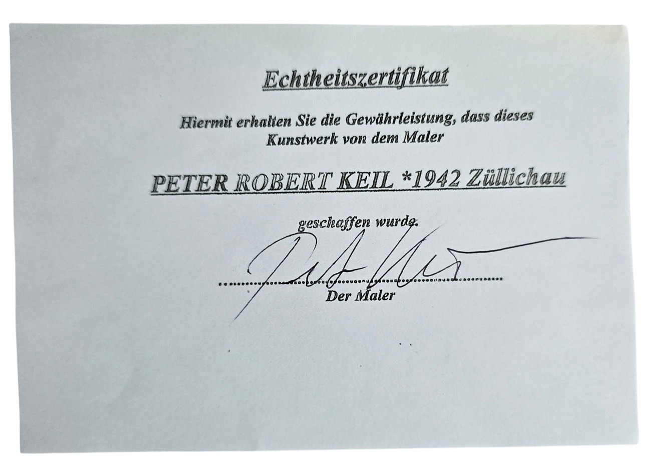 Peter Robert Keil, born on August 6, 1942 in Züllichau, is a German painter and sculptor. In the 1950s, he began training as an art metalworker and subsequently studied at the Berlin University of the Arts from 1959 to 1961. During this time, he was influenced by artists such as Pablo Picasso and developed an expressive, colorful style of painting.